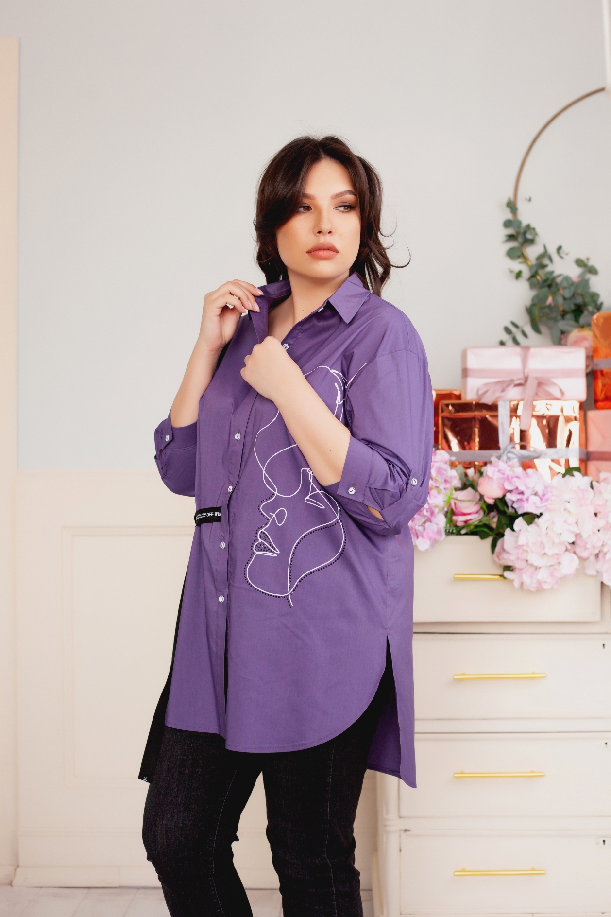 Сногшибательная стильная женская рубашка. Рубашка прямого силуэта. Застежка центральная на петли и пуговицы. Рукав одношовный, слегка спущен. Длина рукава 7.8. Низ рукава на притачной манжете с застежкой на пуговицу. Длина рукава регулируется за счет хлястика. Воротник рубашечного типа, отложной с отрезной стойкой. Спинка изделия длине полочки на 15 см. В рубашке разрезы по бокам для свободы движений. Низ изделия закругляется к боковому шву. Модель декорирована стильной контрастной печатью со стразами, с другой стороны рубашки декоративные ленты, которыми можно регулировать ширину рубашки. Такая модель рубашки создает эффектный и нарядный образ. Добавив акценты аксессуарами, Вы наверняка станете королевой вечера! Размер 50 длина рукава 44 см, длина изделия по спинке 99 см.