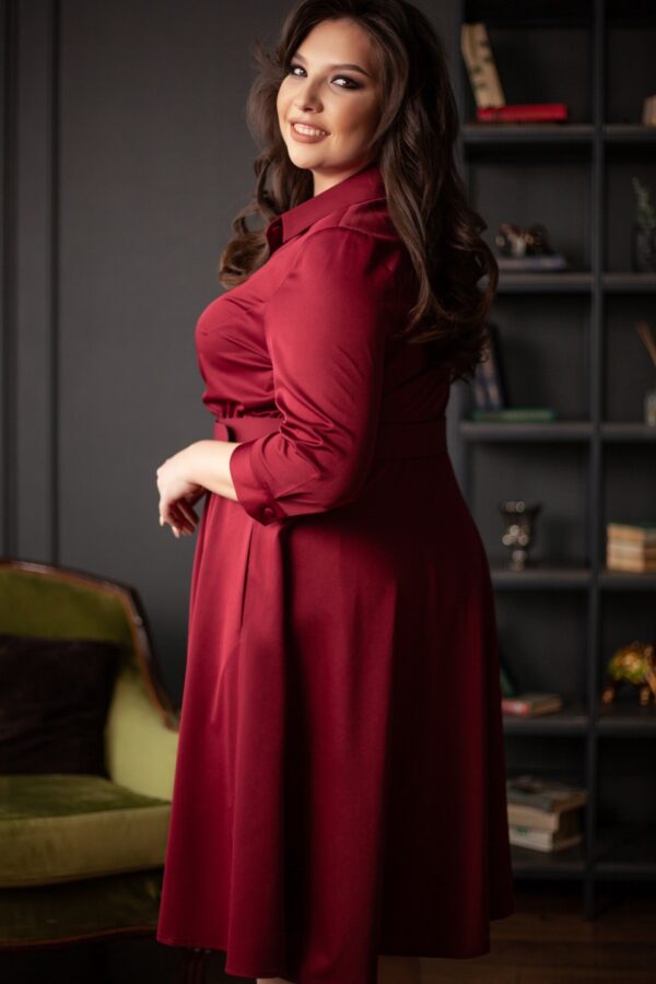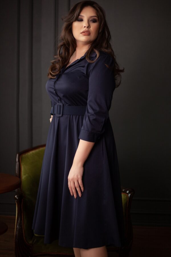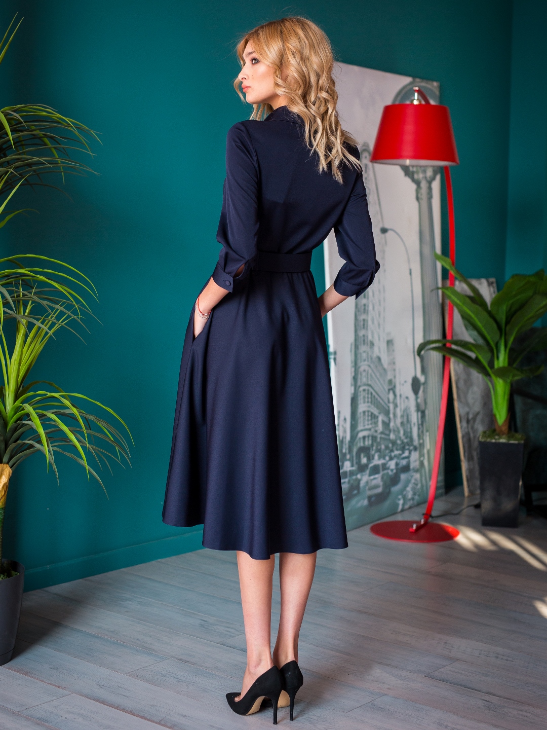 Платье женское из струящейся ткани с эффектом шелка. Перед платья с планкой до талии на петли пуговицы и рубашечным воротником. Платье с карманами в боковых швах. Рукав втачной, одношовный, по низу с притачной манжетой, с застёжкой на петлю-пуговицу. Юбка полусолнце. Платье с поясом из основной ткани. Идеальное платье с акцентом на талии и обтянутой пряжкой — идеально подходит в повседневный гардероб. Платье рубашечного плана — новый тренд сезона, выглядит эффектно и подходит девушкам и женщинам всех возрастов и любой комплекции. Однотонные платья — основа, которую можно сочетать с чем угодно. Такие платья всегда многофукциональнее, чем платья с принтами. Смело можно сделать акцент на ярких и эффектных украшениях и аксессуарах. Ткань неприхотлива в уходе и носке. Благодаря наличию эластана, платье хорошо сидит по фигуре. Изделие без подкладки. Пояс входит в комплект. Размер 50 длина рукава 47 см, длина изделия по спинке 111 см.